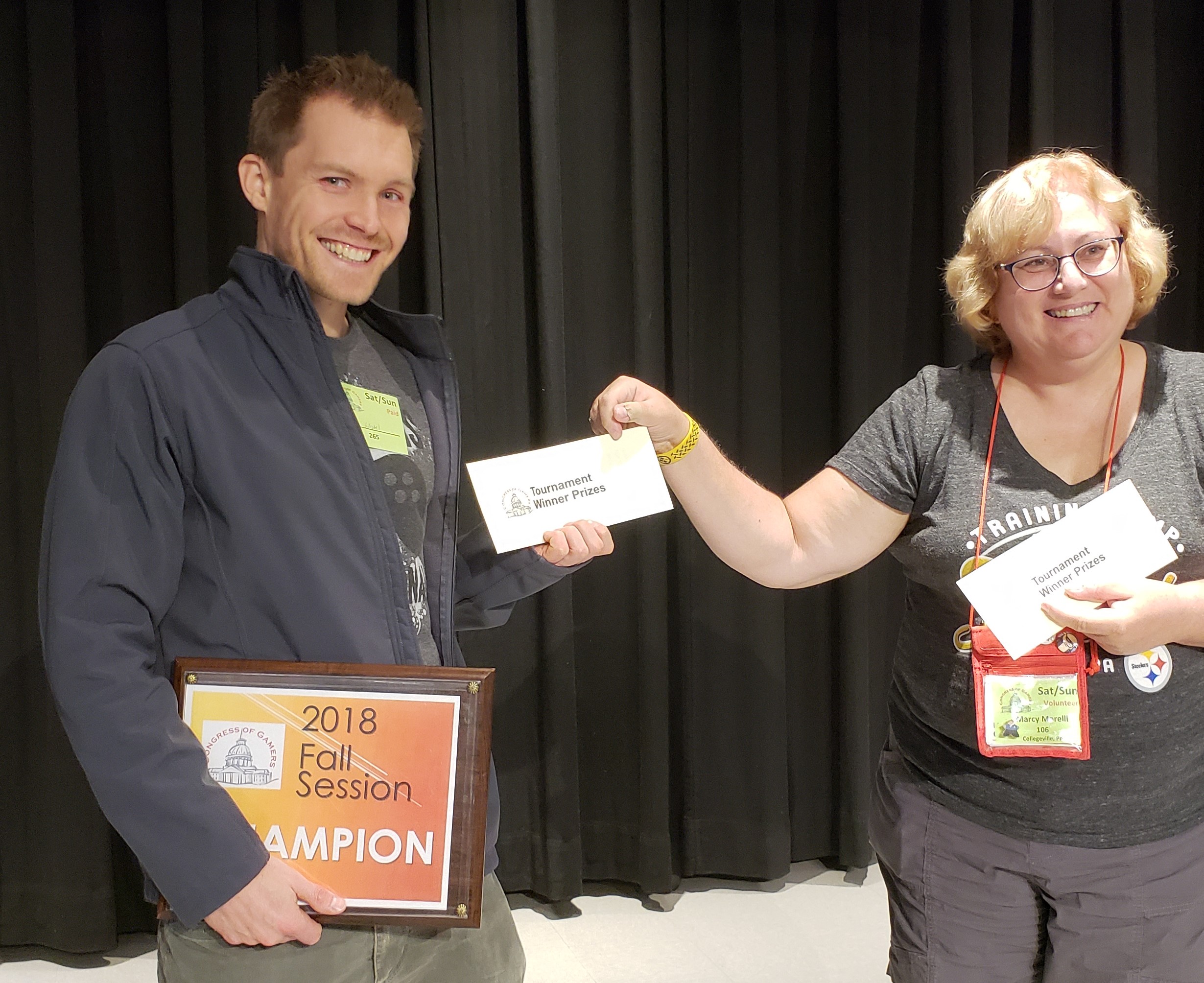 CoG newcomer (but World Boardgaming Championships veteran) Eric Wroble defeated our perennial champion, Eugene Yee, with seven first place finishes to Eugene's five first and two second places. Congratulations, Eric and Eugene!