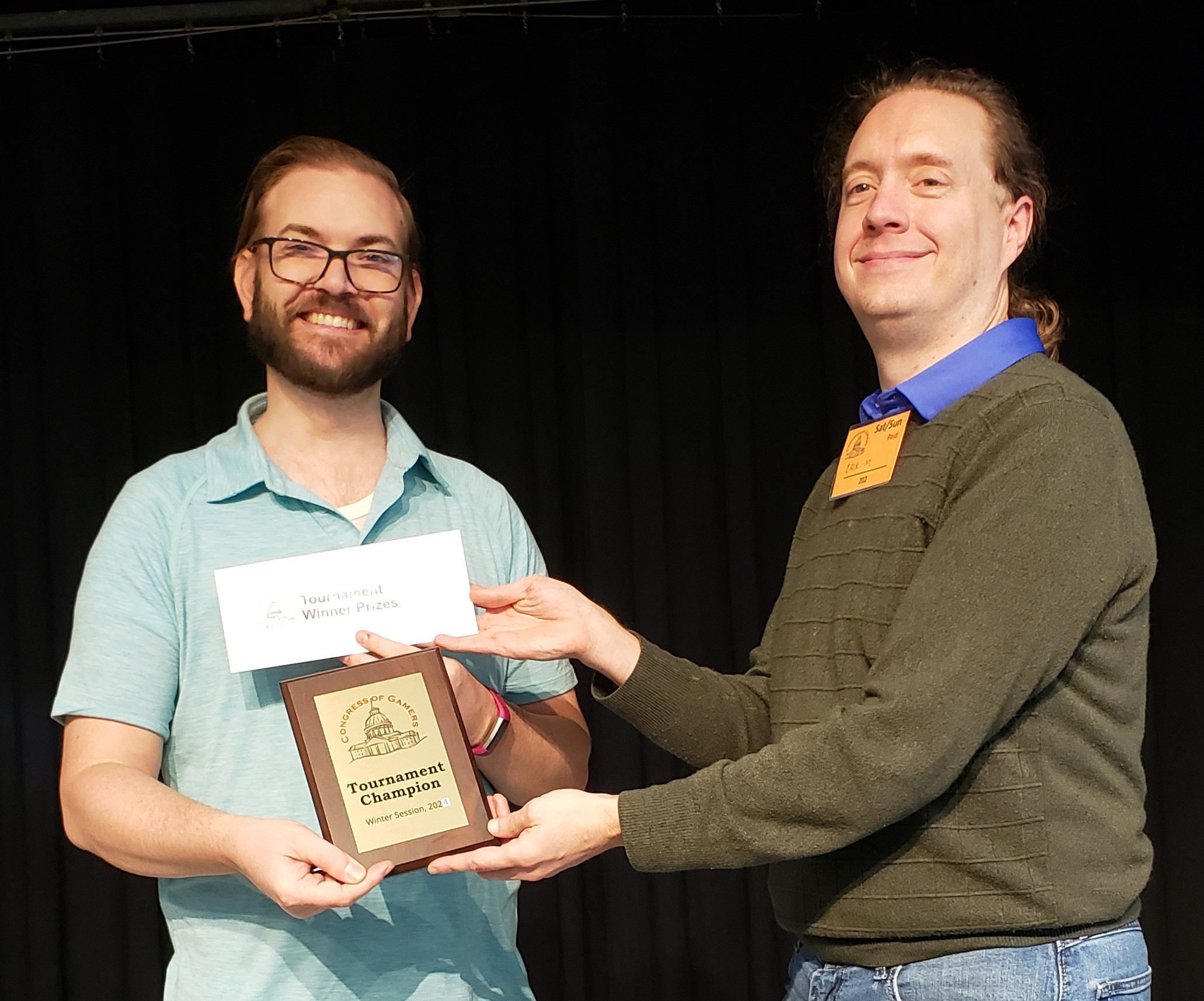 Daniel Cerveny! Congratulations, Daniel! This photo shows Daniel (left) receiving his prizes from the former champion (right) Erik Mooney.